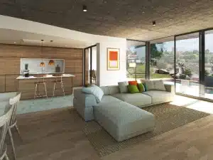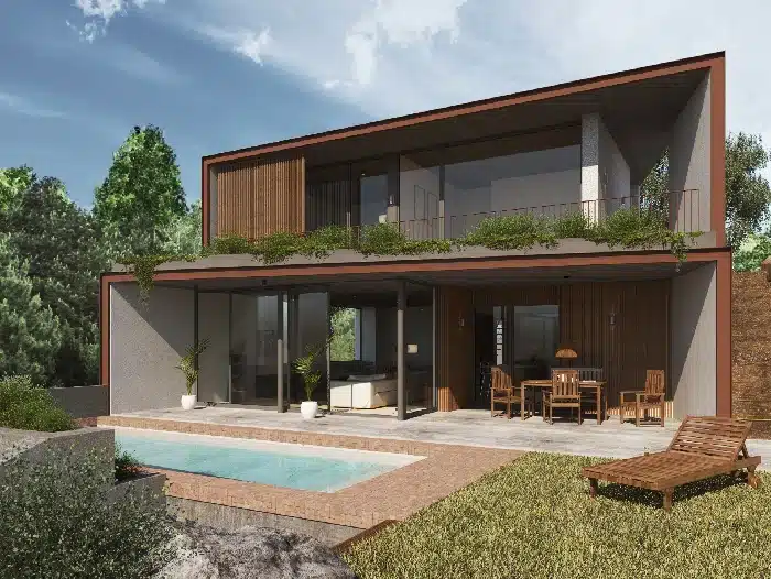 Dom zbudowany z wysokiej jakości materiałów, ściany i sufity odsłonięte betonem, duże okna, podłogi wykonane z naturalnego drewna i porcelany najwyższej jakości.