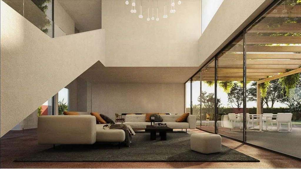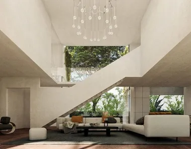 Składa się z salonu-jadalni-kuchni o powierzchni 85 m2, pokoju typu master suite o powierzchni 40 m2, kolejnego pokoju z łazienką o powierzchni 30 m2, 2 przestronnych pokoi dwuosobowych o powierzchni 15 m2, 5 łazienek i wielofunkcyjne studio o powierzchni 30 m2. Dom jest uzupełniony 2 pomieszczeniami usługowymi (pralnią i magazynem), duży taras na drugim piętrze oraz maszynownię odizolowaną od domu, aby uniknąć wszelkiego rodzaju hałasu. Na pozostałej części działki znajduje się parking, basen, ogród i sad.Dom został zaprojektowany tak, aby uzyskać maksymalną wydajność cieplną, przy użyciu materiałów i