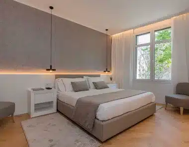 Historic building, listed as a monument, restored and refurbished with exquisite design. The renovation project included the restoration of the façade and the preservation of the most characteristic features such as balconies, main stairs, marble floor, wrought iron main door and wooden doors of the houses.