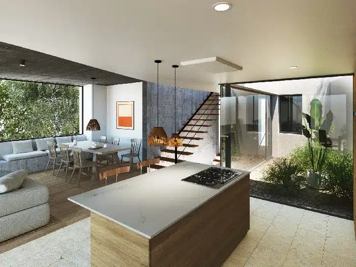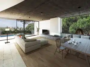 Dom zbudowany z wysokiej jakości materiałów, ściany i sufity odsłonięte betonem, duże okna, podłogi wykonane z naturalnego drewna i porcelany najwyższej jakości.